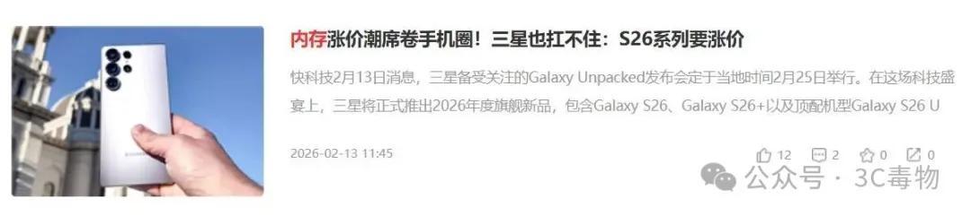 由於內存漲價的影響,三星S26系列也扛不住了,大概率會漲價。