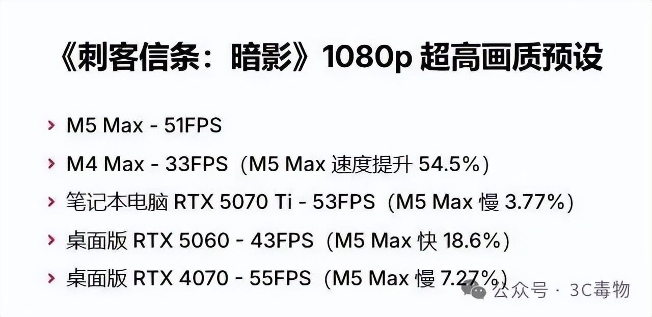 從多個遊戲的測試結果來看,M5 Max處理器的性能,和RTX 4070基本上持平。