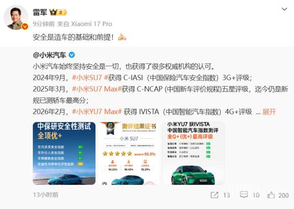 【CNMO科技消息】2月28日,小米創辦人雷軍發文表強調:安全是造車的基礎和前提!並轉發了小米汽車安全性能獲得多項權威機構認可的相關信息。