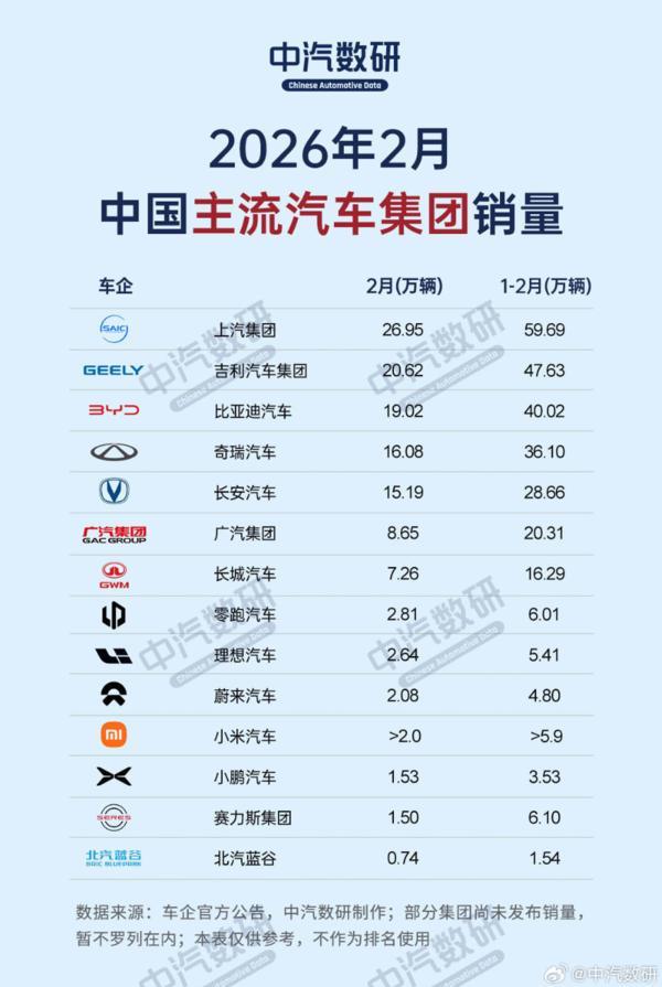 【CNMO科技消息】3月4日,中汽數研整理並公佈了2026年2月14家國內主流汽車集團銷量榜單。
