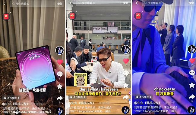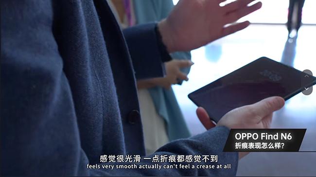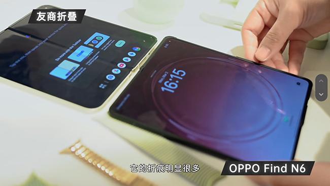 隨後,她選用海外用戶熟知的友商摺疊屏機型,在相同光線條件下進行直觀對比。畫面中清晰可見,友商機型內屏摺痕明顯,而 OPPO Find N6 內屏近乎無痕,兩者差距一目瞭然。