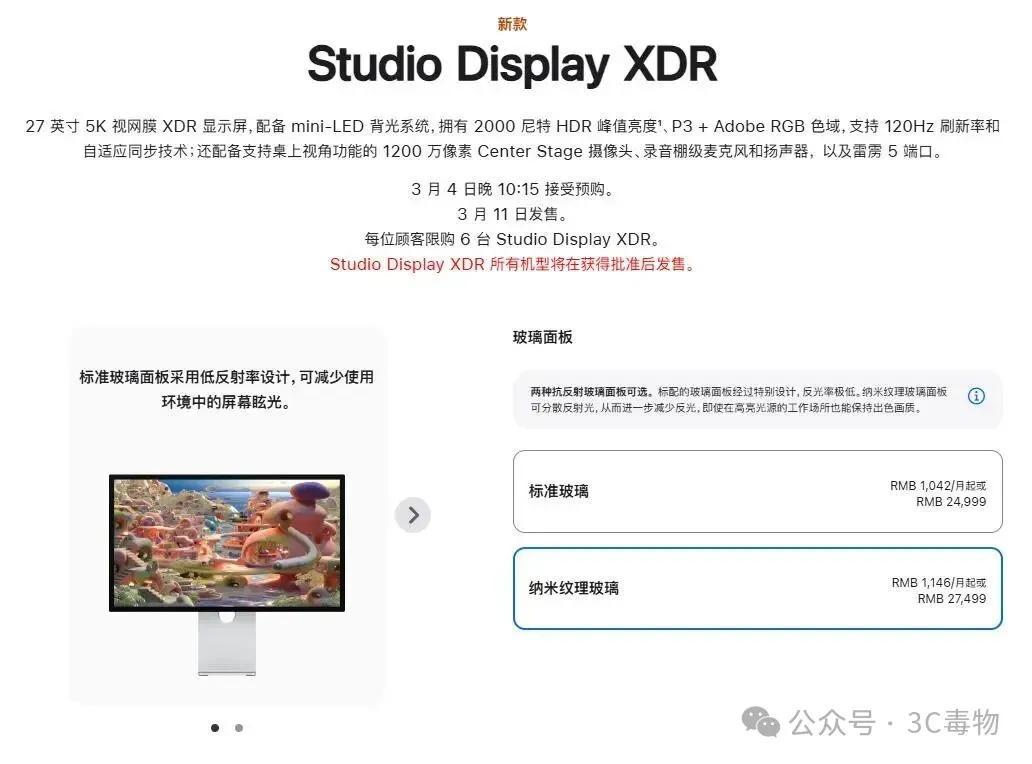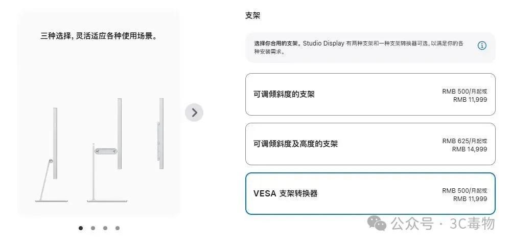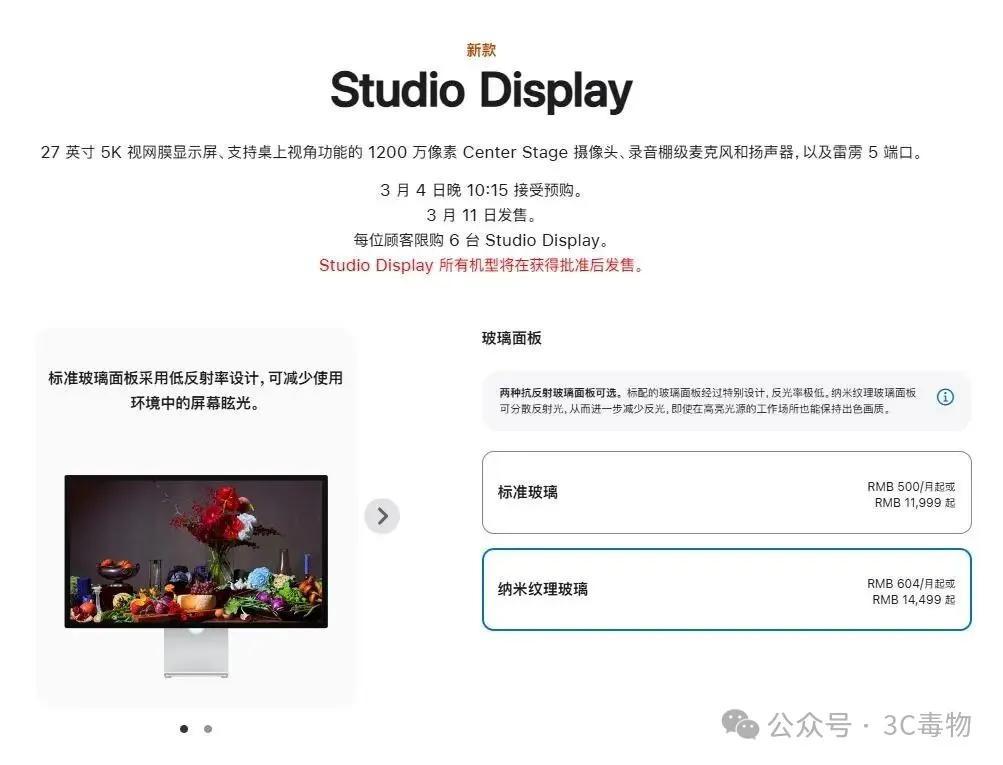毒哥將Stuido Display的配置全部拉滿,搭載納米紋理玻璃、可調節斜度及高度支架,售價爲17499元。