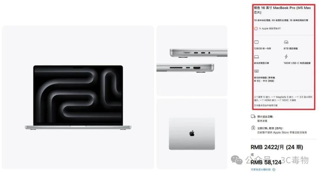毒哥嘗試將MacBook Pro的配置全部拉滿,最終的售價爲58124元。