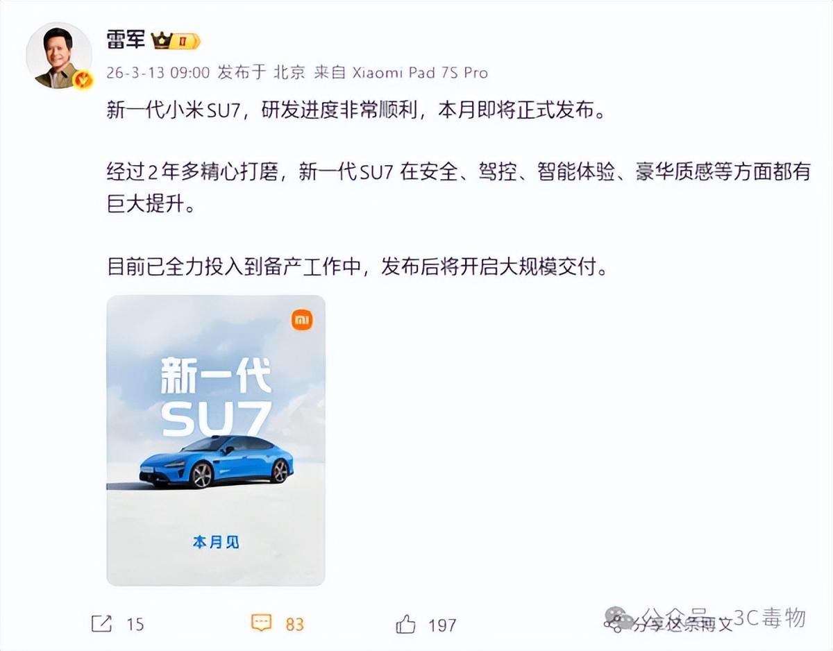 雷軍已經正式發文,表示3月將會正式發佈新一代小米SU7。