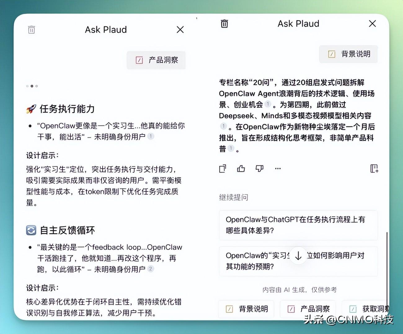 比如,在 Ask Plaud 對話欄裏,可以直接點擊「獲取洞察」、「背景說明」,來定向獲取文檔中的相關內容,所有的答案都會以技能內置的結構展示出來: