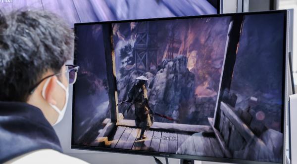 更讓我意外的是,海信沒把這項技術只留在電視上。展臺另一側,全球首款高分區RGB-Mini LED顯示器UX正在運行《影之刃零》。畫面裏角色的服飾細節分明,暗部細節清晰可見,色彩飽和度恰到好處。這款顯示器把電視端的三項核心技術——玲瓏真彩背光、信芯AI畫質芯片H7、黑曜屏——全部平移了過來。