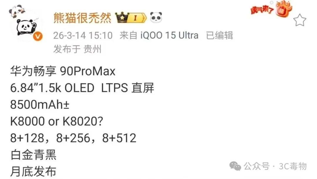 但已經有網友,提前透露了華爲暢享90ProMax的相關配置信息。