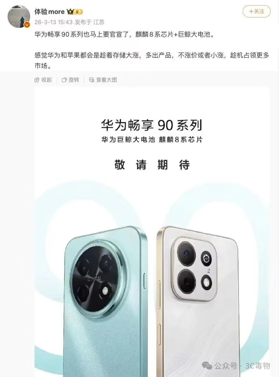 華爲暢享90系列將會搭載華爲巨鯨電池,同時處理器爲麒麟8系列芯片。