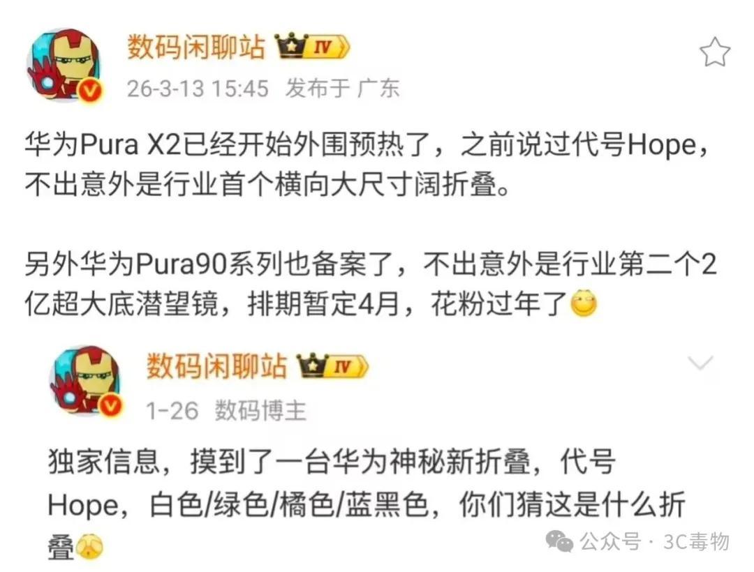 有網友發文表示,華爲接下來將要發佈的兩款重磅新機,分別是華爲PuraX2、華爲Pura90系列。
