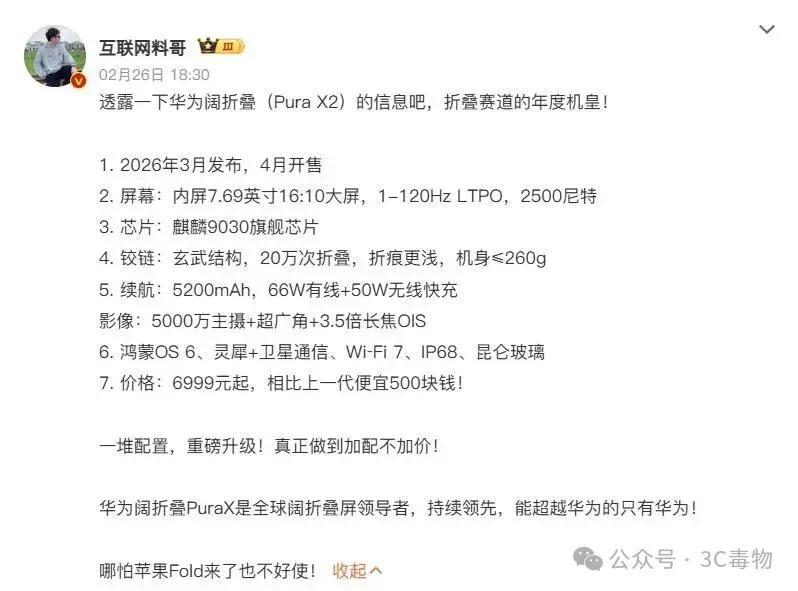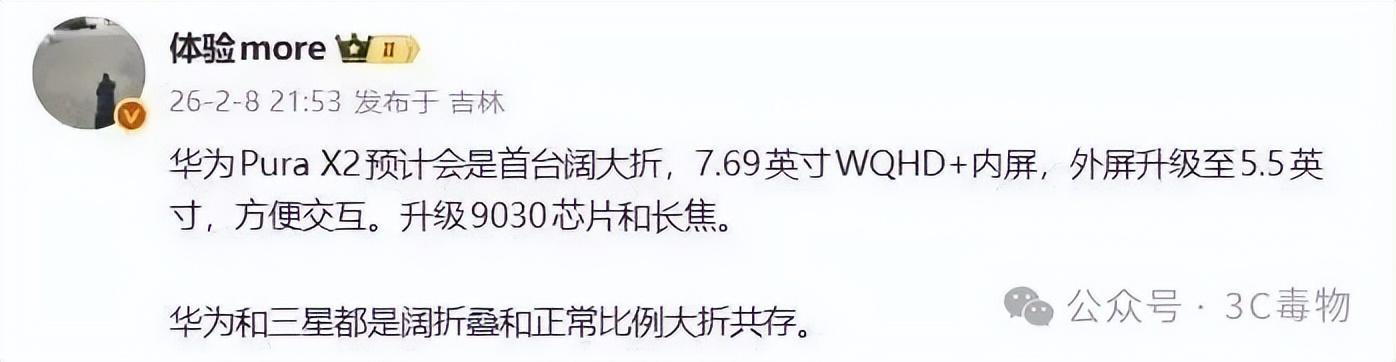 同時,華爲PuraX2將會是全球首款大摺疊屏手機。