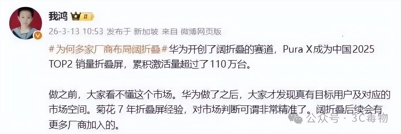 全球首款闊摺疊屏手機,華爲PuraX累積激活量已經達到110萬臺。
