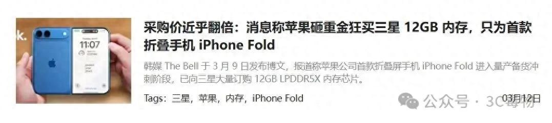 蘋果爲了首款摺疊屏iPhone,正在砸重金購買三星12GB運存。