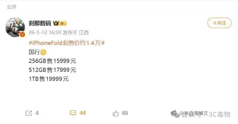 有網友發文表示,iPhone Fold將會有三個存儲版本發售。