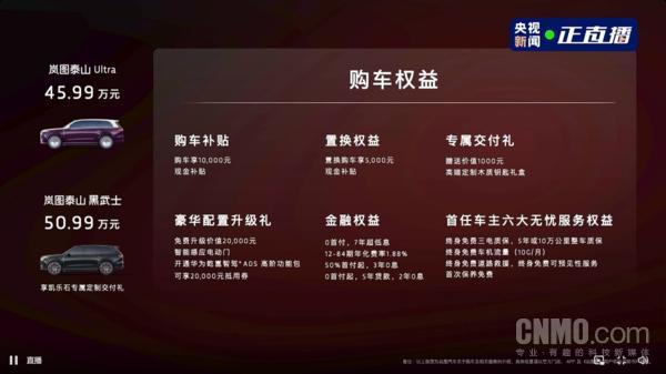 值得一提的是,嵐圖泰山Ultra與黑武士版上市同步推出多項購車權益,具體如上圖所示。