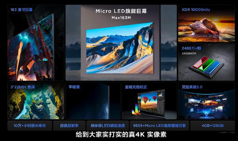 Micro LED被業界廣泛認爲是顯示技術的新方向,不過由於其在技術上,還面臨着諸多技術挑戰,如巨量轉移、高質量全綵化顯示、成本與良率等問題,還沒能實現真正大規模量產。TCL作爲超大屏電視領域的拓荒者和引領者,在2024年發佈首款163吋Micro LED巨幕,首次將163"的Micro LED巨幕引入消費級市場,兩年後的今天,TCL帶來兩款163"的Micro LED,最低只要249999元即可入手體驗,讓更多人可以享受到163"超大屏體驗。