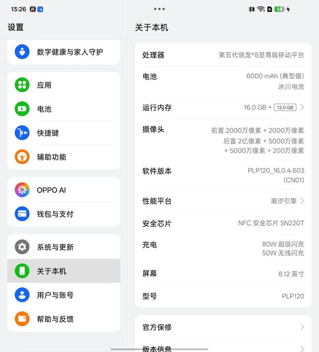 與輕薄機身形成鮮明呼應的是OPPO Find N6在電池方面的進步。這次它配備了容量高達6000mAh的冰川電池,相對於上代提升明顯,同時還支持80W有線+50W無線充電,外出一天不用擔心電荒。