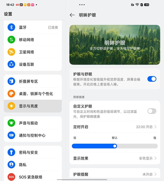 在摺痕控制之外,OPPO Find N6的屏幕素質同樣可圈可點。內外雙屏都支持1800尼特全局峯值亮度和最低1尼特的亮度——烈日下信息清晰可見,深夜刷手機也不會刺眼。2160Hz高頻PWM調光、舒眠模式、舒適色溫和AI護眼等功能一應俱全,無論用內屏還是外屏,長時間閱讀都能保持舒適。內屏尺寸爲8.12英寸,展開後視野開闊;外屏6.62英寸,合上時握持順手。兩塊屏幕觀感一致,切換使用也沒有明顯落差。