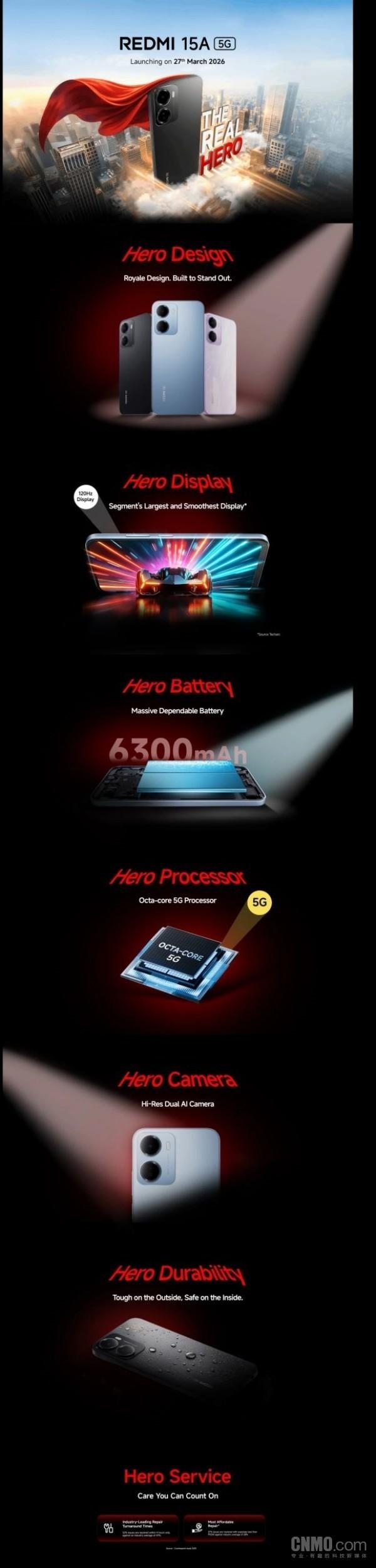 【CNMO科技消息】3月20日,REDMI宣佈將於3月27日在印度發佈REDMI 15A 5G。新機的宣傳語爲“THE REAL HERO”。