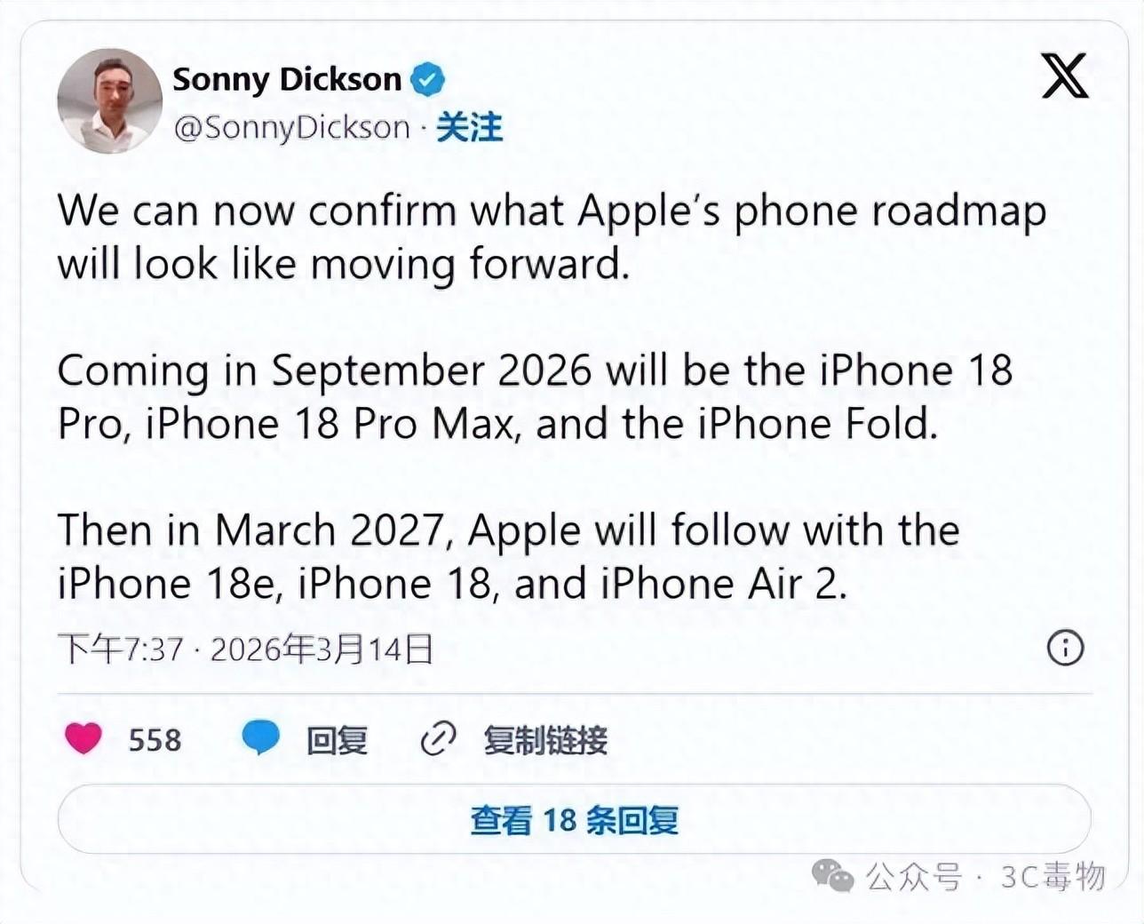 2027年3月,將會發布iPhone18e、iPhone18、iPhone Air2。