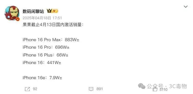 雖然累計激活量不如iPhone16系列的其他機型,但依然是iPhone Air累計激活量的3倍。