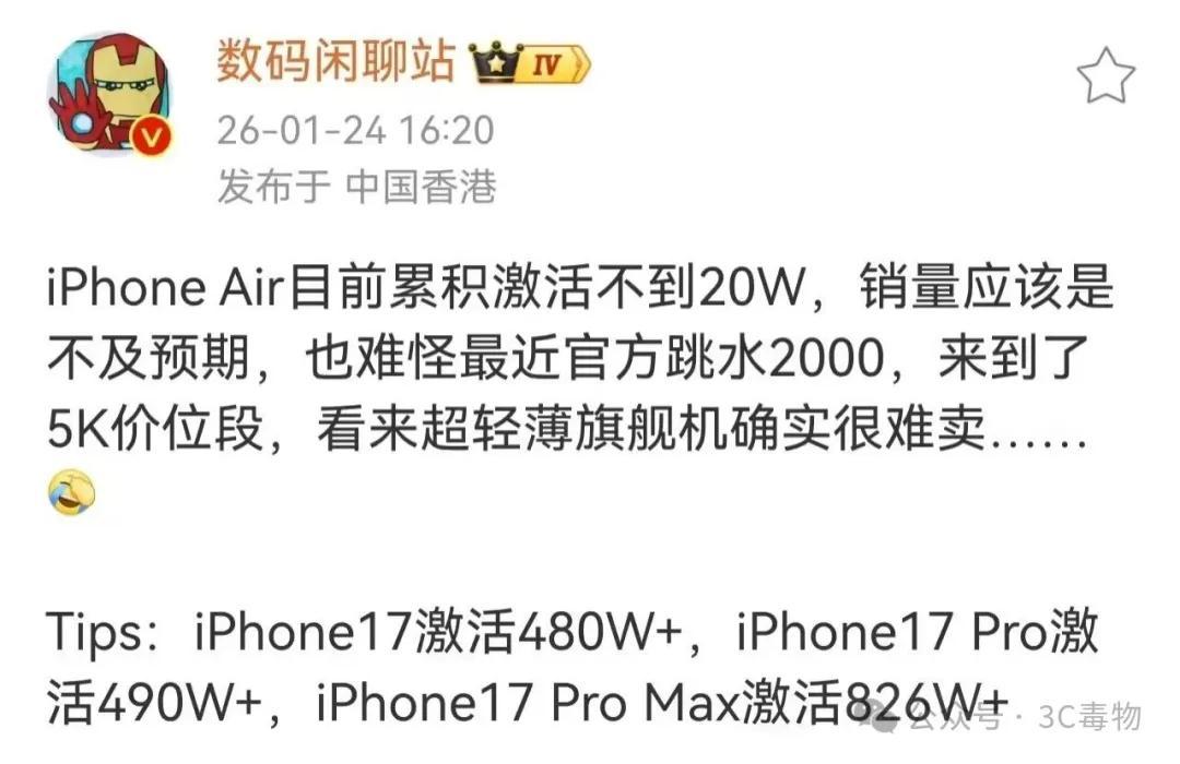 也就是說,iPhone Air的激活量連iPhone17ProMax的零頭都沒有。
