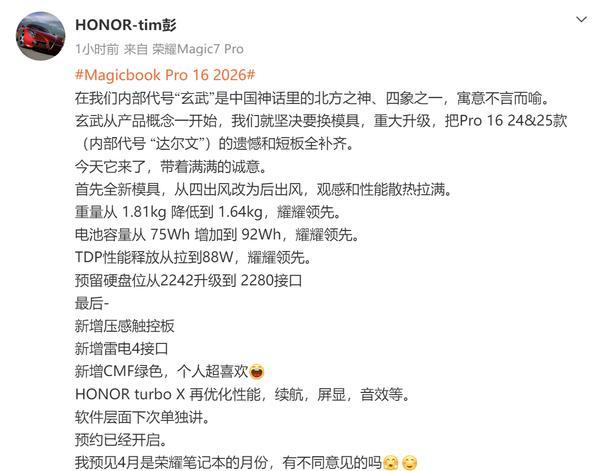 【CNMO科技消息】3月31日,CNMO注意到,疑似榮耀內部員工,賬號“HONOR-tim彭”發文爆料了榮耀MagicBook Pro 16 2026款的相關信息。據悉,該產品內部代號爲“玄武”,在中國神話中,“玄武”是北方之神、四象之一,這一代號寓意着榮耀對該產品寄予厚望。