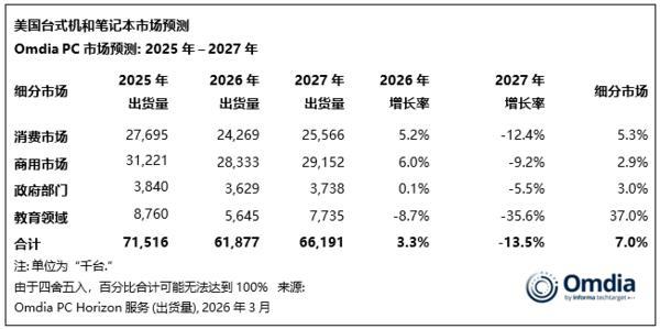 【CNMO科技消息】3月31日,Omdia最新研究顯示,2025年第四季度,美國PC出貨量(不含平板)同比增長3%,達到1820萬臺。其2025年PC出貨量達到7150萬臺,同比增長3%。由於內存和存儲產品供應高度受限,Omdia預測, 美國PC出貨量將在2026年同比下降13%,約爲6190萬臺,並在2027年實現溫和回升。