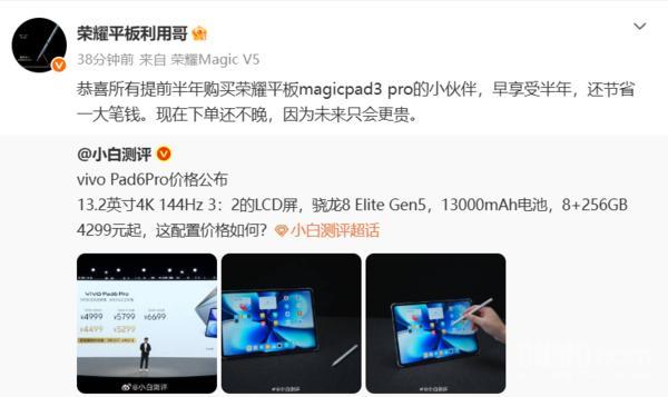 【CNMO科技消息】3月31日,榮耀平板與IOT產品領域總經理“榮耀平板利用哥”發文稱,恭喜所有提前半年購買榮耀平板MagicPad 3 Pro的小夥伴,早享受半年,還節省一大筆錢。現在下單還不晚,因爲未來只會更貴。