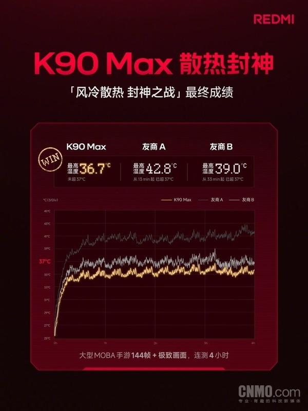 在REDMI近期舉辦的一場4小時重載遊戲直播測試中,REDMI K90 Max展現了優秀的散熱性能。在大型MOBA手遊以144幀+極致畫面的高強度運行下,K90 Max的最高溫度未超過37℃,遠低於進行對比測試的友商A、B機型(分別爲42.8℃和39℃)。
