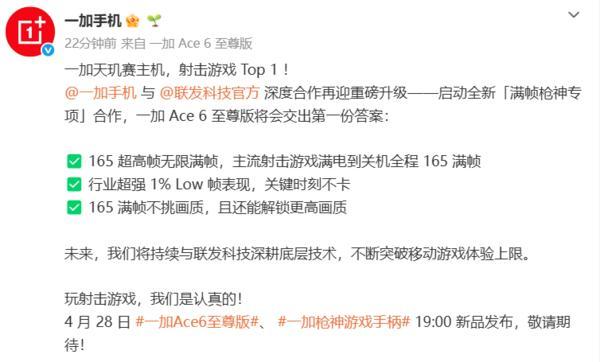 【CNMO科技消息】4月21日,聯發科技與一加手機聯合宣佈,雙方達成深度戰略合作,正式啓動「滿幀槍神專項」,共同攜手打造射擊遊戲滿幀體驗標杆。此次合作標誌着天璣旗艦芯片與一加「風馳遊戲內核」已實現底層全面融合,而首款搭載這一深度攻堅成果的機型——一加Ace 6至尊版,將於4月28日19:00正式登場。