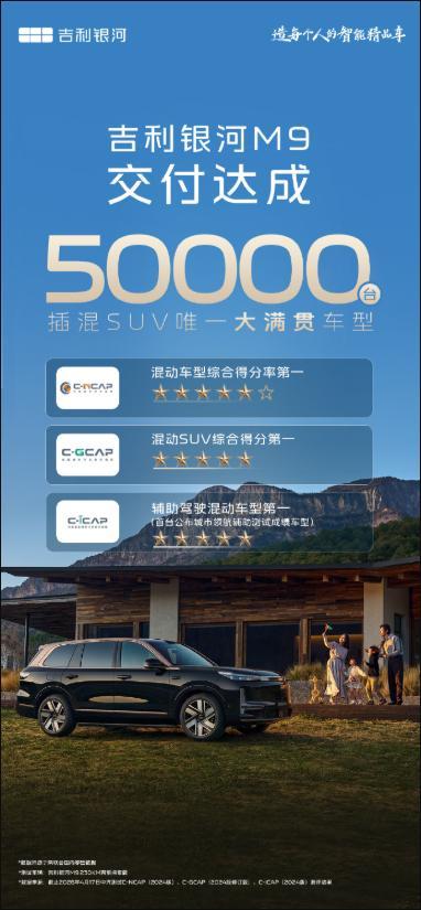 【CNMO科技消息】4月21日,吉利汽車官方宣佈,旗下大六座插混SUV吉利銀河M9交付量正式突破5萬臺,成爲目前插混SUV市場上唯一實現C-NCAP、C-GCAP、C-ICAP三大權威測試“大滿貫”的車型。