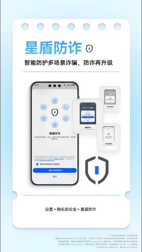 星盾防詐功能是本次隱私安全升級的另一大亮點。該功能可一鍵開啓,智能攔截多場景詐騙風險,覆蓋來電攔截、風險應用管控、詐騙網站檢測等多個維度。星盾防詐可識別並阻斷符合詐騙劇本的行爲,主動攔截風險並實時提醒,覆蓋虛假客服、刷單返利等高頻騙局。在通話場景中,系統可識別詐騙話術並實時彈窗提醒;視頻通話時還可檢測對方是否使用AI換臉技術。此外,星盾防詐支持家人防詐關聯提醒,若家人接到詐騙電話,系統將自動向關聯用戶發出預警,全面呵護家庭隱私安全。