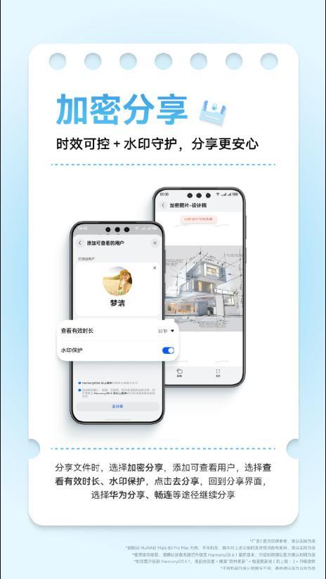 加密分享功能迎來重大升級。用戶通過HarmonyOS 6.1分享重要內容時,新增限時查看功能,可設置文件查看時長與查看次數,到期後將無法訪問文件。同時新增水印保護功能,進一步防止文件被惡意傳播。當用戶將文件分享給他人時,可設置對方只能查看、不能轉發或截圖,文件傳出去之後流向仍可控。此前在HarmonyOS 6.0.0.115版本中,華爲已上線加密分享“僅查看一次”功能,此次6.1版本在此基礎上進一步強化了時限控制和水印防護能力。