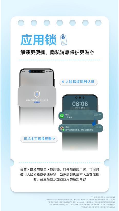 應用鎖功能也得到優化升級。HarmonyOS 6.1中開啓應用鎖更加便捷,隱私消息保護更加貼心,用戶可更輕鬆地管理應用訪問權限,爲個人隱私增添一道安全屏障。此外,系統對敏感權限調用進行了可視化升級,相機、麥克風、定位等權限在後臺調用時會即時提示,杜絕隱私泄露。