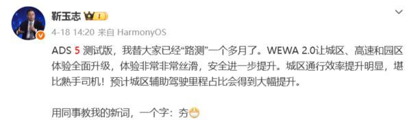 靳玉志近日透露,華爲乾崑ADS 5測試版替大家已經“路測”一個多月,WEWA 2.0架構讓城區、高速及園區道路的駕駛體驗全面升級,體驗非常非常絲滑,安全進一步提升。特別是在城區道路,通行效率的提升明顯,堪比熟手司機,預計城區輔助駕駛里程佔比會得到大幅提升。