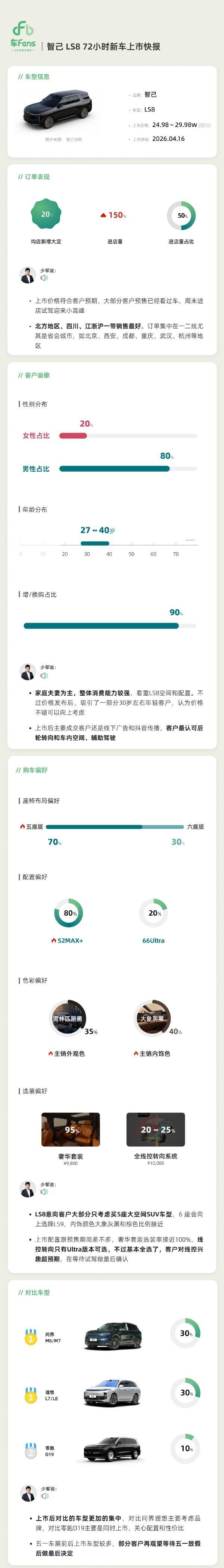 銷售區域方面,北方地區、四川以及江浙滬一帶表現突出,訂單集中在一二線城市,尤其是省會城市如北京、西安、成都、重慶、武漢、杭州等地。客戶畫像顯示,購車羣體以27至40歲的男性爲主,佔比達80%,增換購比例高達90%。家庭夫妻組合是主要消費羣體,消費能力較強,看重LS8的空間和配置。價格公佈後,部分30歲左右的年輕客戶也被吸引,認爲價格合理值得考慮。