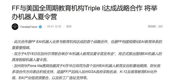 【CNMO科技消息】4月21日,Faraday Future(以下簡稱“FF”)宣佈,已與美國全週期教育規劃機構Triple I正式簽署戰略合作協議,全面開啓雙方在EAI(具身人工智能)教育領域的合作,並聯合推出具身智能機器人夏令營。這是FF EAI機器人業務首個與教育機構達成的戰略合作,標誌着“人車+教育”場景迎來規模化落地的新里程碑。