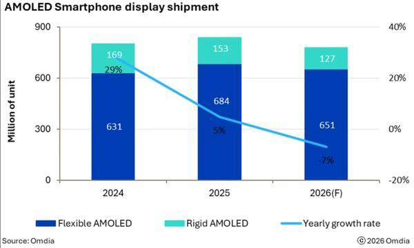 七年首降!機構稱2026年AMOLED智能手機面板出貨量將大幅下滑