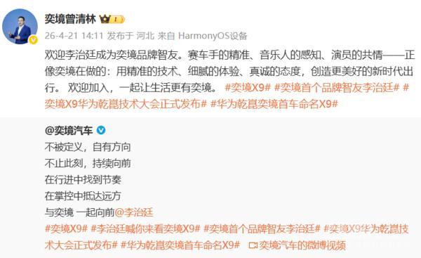【CNMO科技消息】4月21日,奕境汽車品牌總經理曾清林發文歡迎李治廷成爲奕境品牌智友。曾清林表示,賽車手的精準、音樂人的感知、演員的共情——正像奕境在做的:用精準的技術、細膩的體驗、真誠的態度,創造更美好的新時代出行。