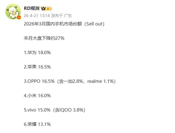 【CNMO科技消息】4月21日,據博主“RD觀測”公佈的最新數據,2026年3月中國手機市場出貨量整體大盤同比下降約27%。當月品牌份額排名也發生相應變化。