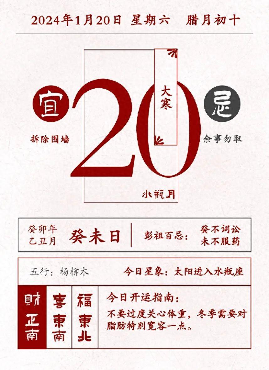 今天不適合暴飲暴食,再好喫的東西也不要喫太多。你最近發現了一些很喜歡喫的食物,但是喫太多對消化不好,很可能引發腸胃炎。所以建議你學會節制,不要只喫某一種食物,而應該保證多種營養的攝入。也別光知道喫,該運動也是要運動的。