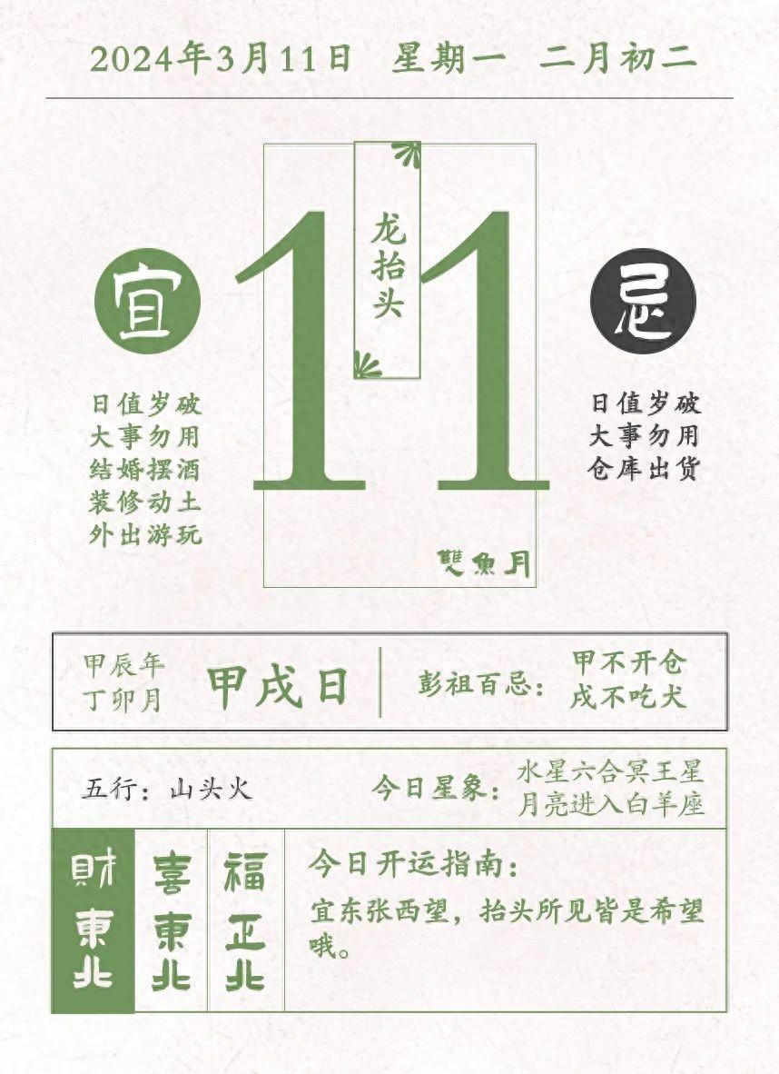 今天的你顯得特別懷舊。你想重溫過去流行的影像作品,喜歡聽老歌,很久以前的歌單也被你翻了出來。在衣着上,你也可以試試復古風。經典的款式和配色加上國風小飾品,會改善你的氣場,幫你帶來好人緣。