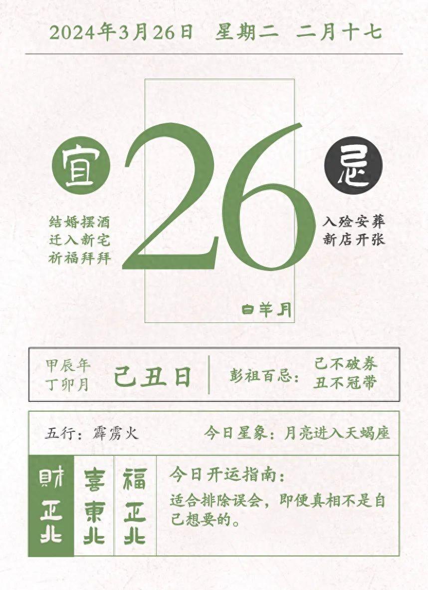你今天會審視自己的財務狀況,希望增加睡後收入。可能是因爲健康、學習、婚慶家宴等原因,你不得不花掉自己的積蓄。這些大額消費也讓你重新審視自己的財務狀況。今天適合樹立新的儲蓄計劃,學習投資理財的方法。
