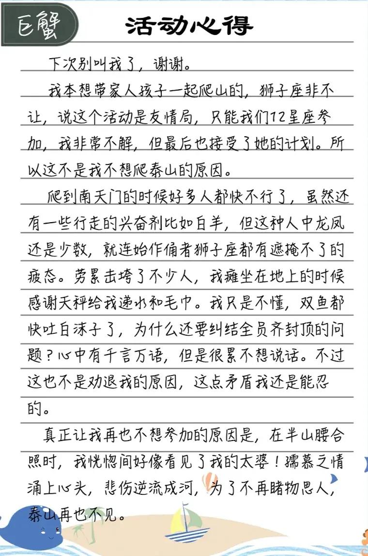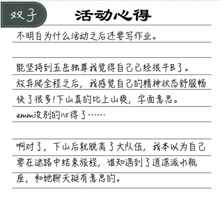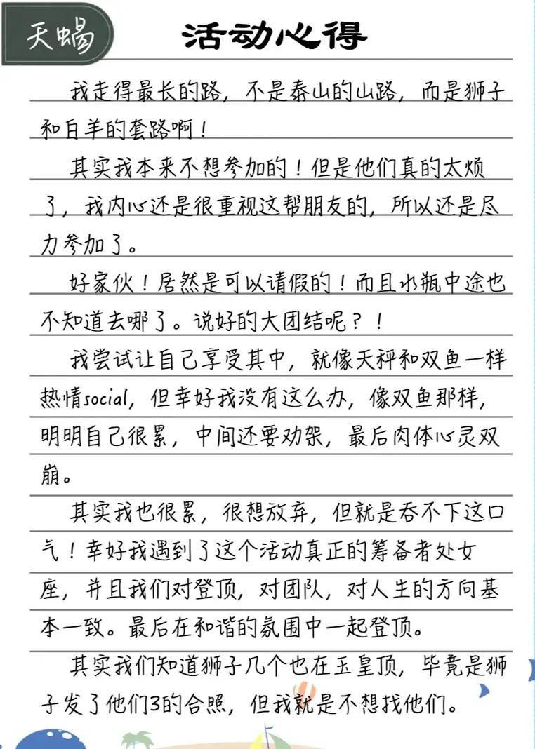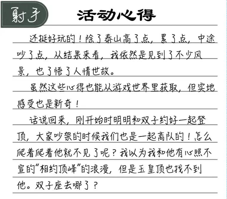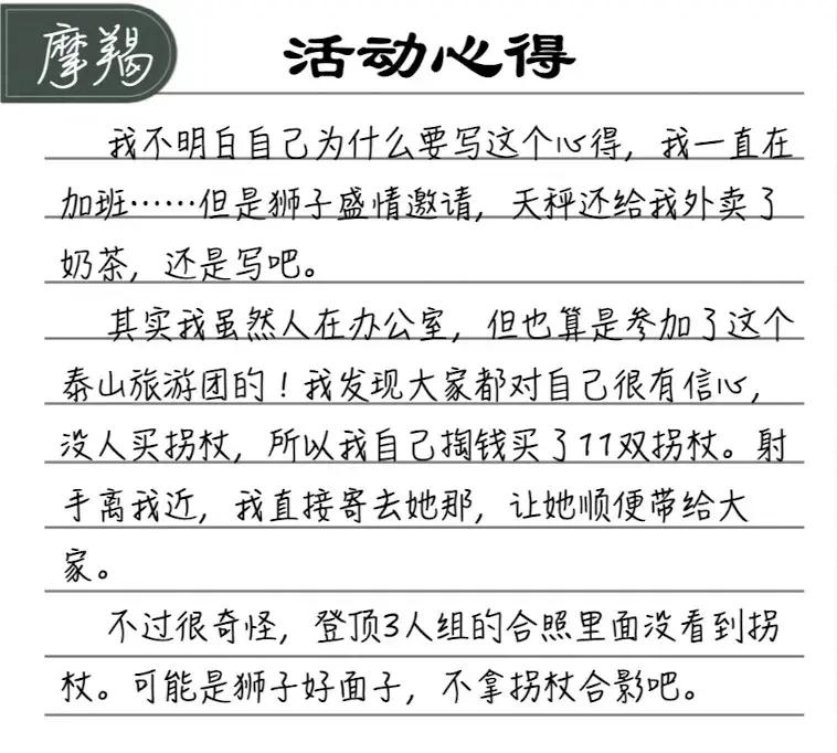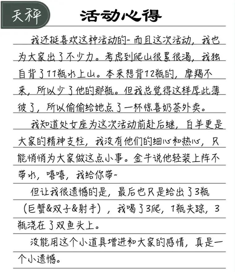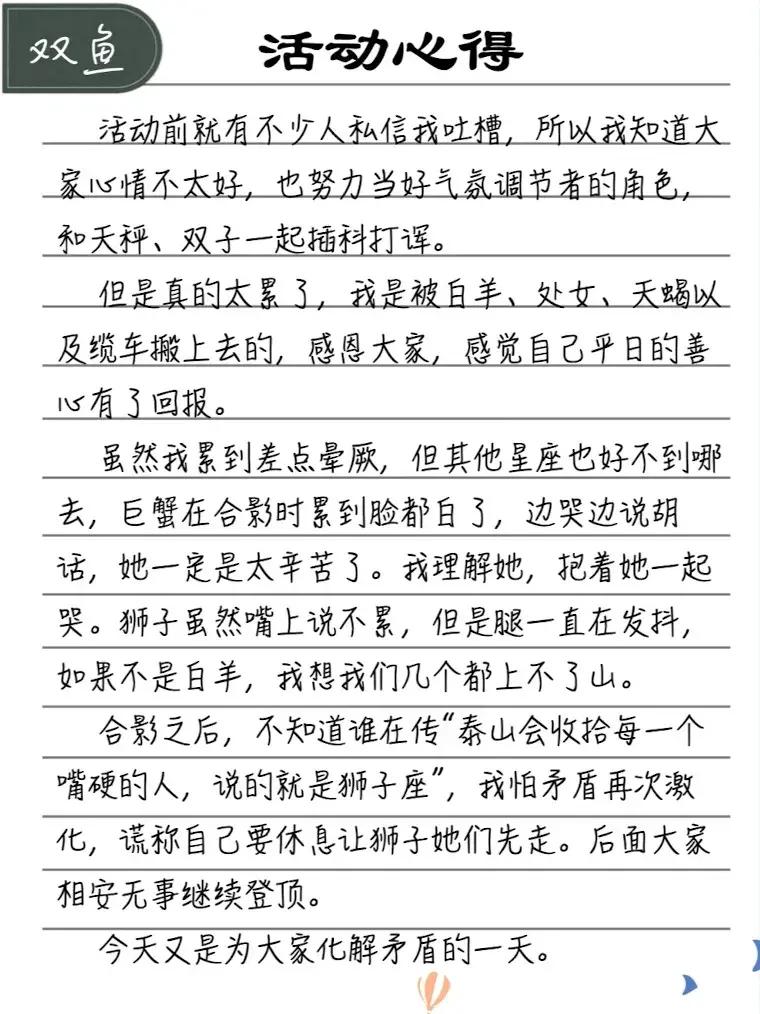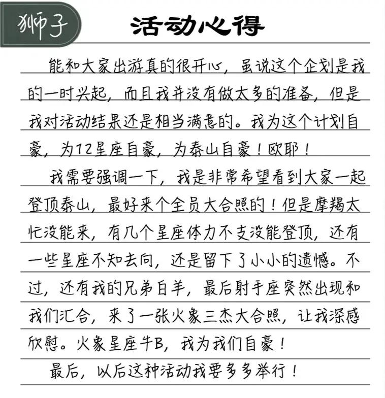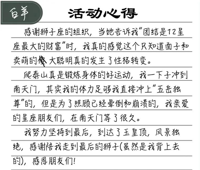 在領隊獅子座的英明帶領下,各星座進行了一場酣暢淋漓又團結友愛的爬山活動。不僅看到了我國的大好山河,還留下了不少的合照,笑容,健康,互助和友情,大家紛紛讚賞了組織者的英明。