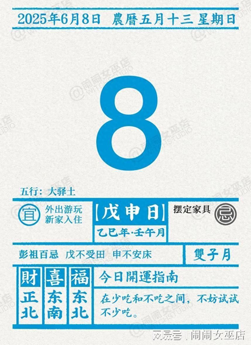今天不適合暴飲暴食,再好喫的東西也不要喫太多。你最近發現了一些很喜歡喫的食物,但是喫太多對消化不好,很可能引發腸胃炎。所以建議你學會節制,不要只喫某一種食物,而應該保證多種營養的攝入。也別光知道喫,該運動也是要運動的。