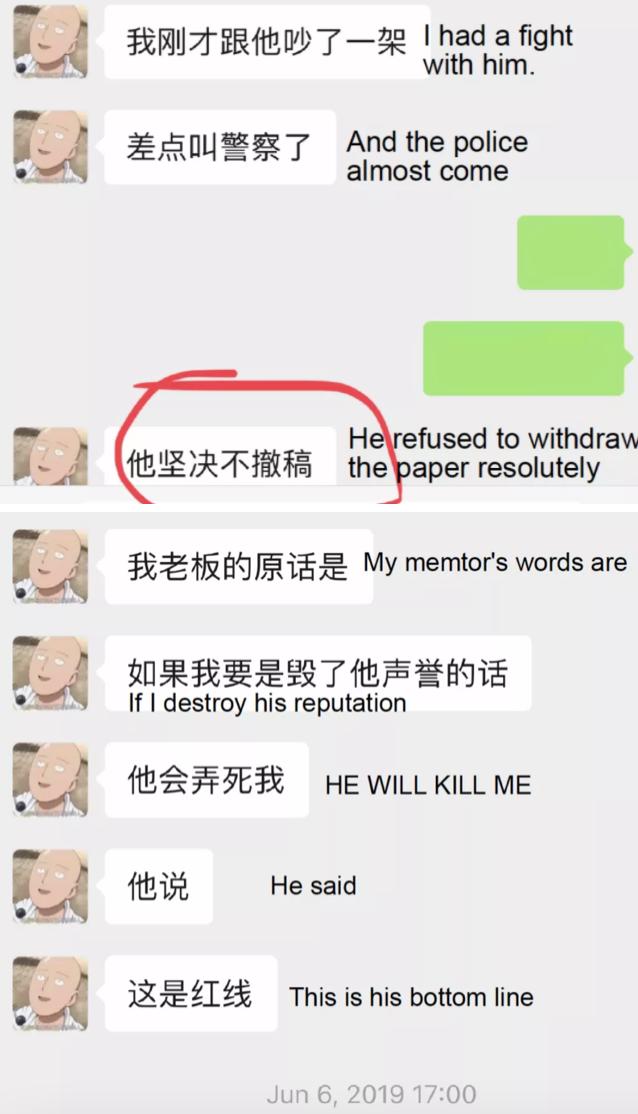 但是其中存在的漏洞是極易發現的,作爲一名博士生,陳慧祥忍受不了這樣的學術造假。他鼓足勇氣跟李濤進行溝通,希望能夠撤稿進行二次修改完善。但沒想到李濤的態度更加強硬,直接放話:如果還想畢業,就必須要發表論文!