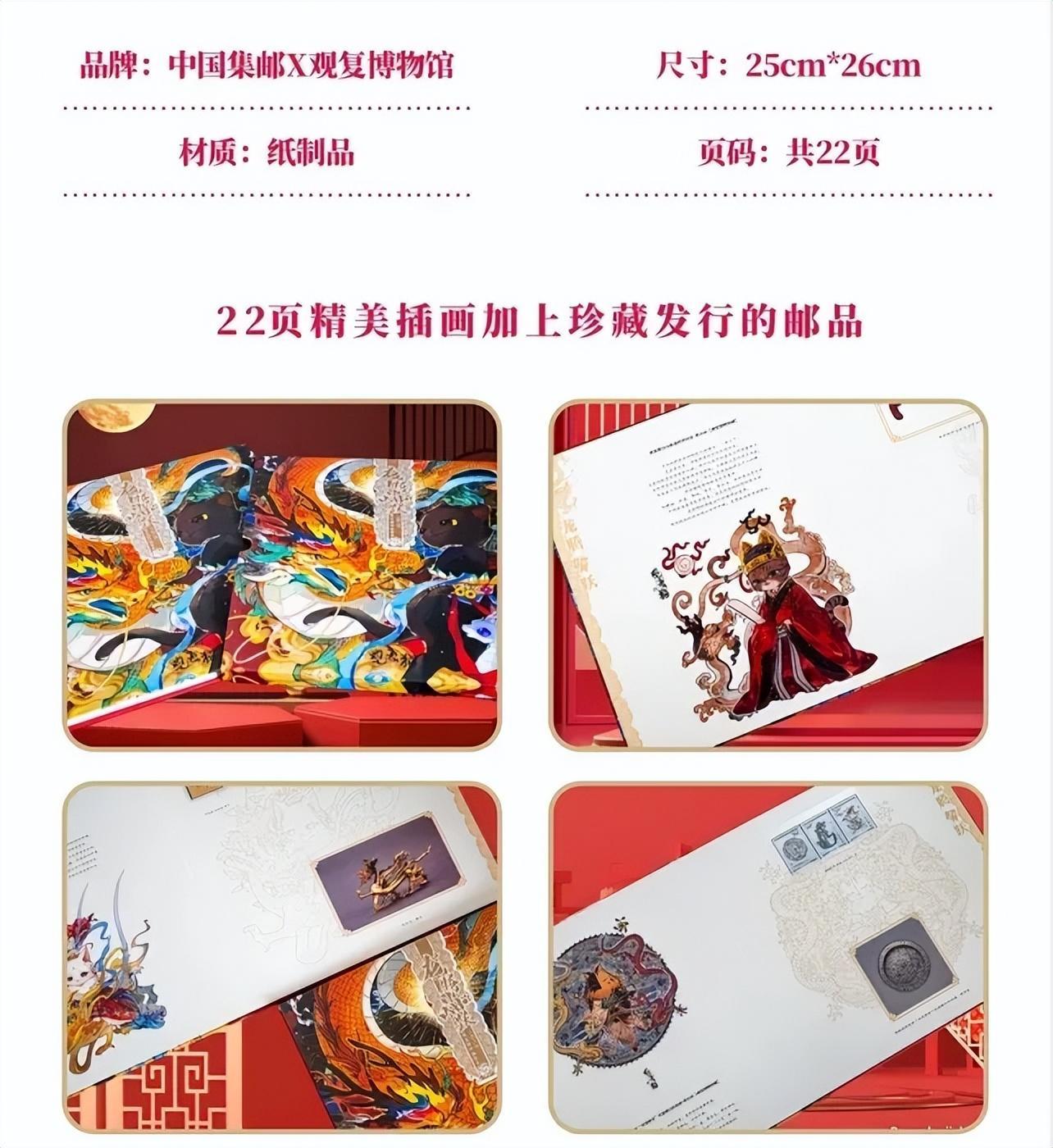 此《龍騰喵躍》紀念郵冊,收錄了包括2024-1《甲辰年》龍年生肖特種郵票在內的,諸多頗具龍年新春氛圍的珍藏郵品,搭配22頁原創精美插畫裝幀成冊,並隨冊附贈龍年主題明信片和觀復貓龍年插畫帆布袋。