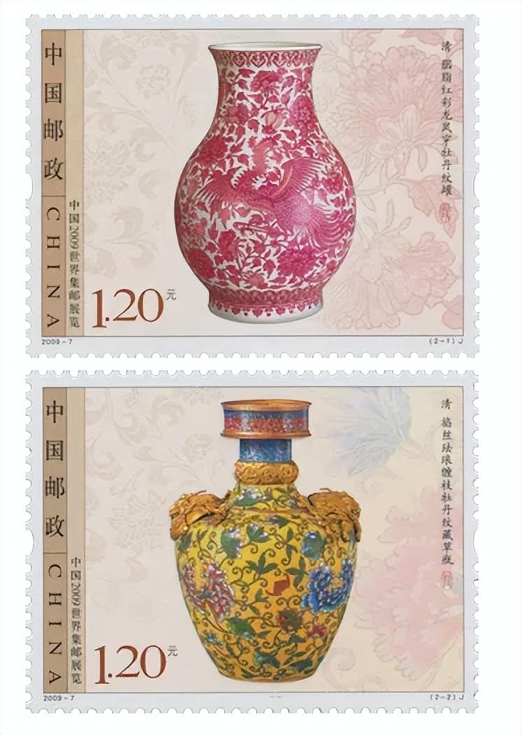 郵票1套2枚。圖案分別爲:胭脂紅彩龍鳳穿牡丹紋罐、掐絲琺琅纏枝牡丹紋藏草瓶。