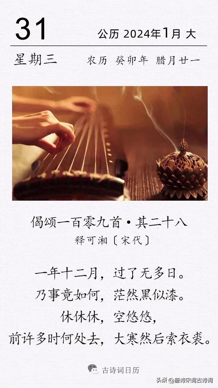 “前許多時何處去,大寒然後索衣裘。”時間都去哪了,不知不覺就過了大寒,到了準備新衣過年的時候了。這裏面頗有蘇東坡“人間如夢”的感覺。時間匆匆流逝,又到年末時節,我們真的應該好好想一想,來年應該怎麼過?是如今年,還是重新選擇,重新出發,是做自己生命的主角,抑或停留在原地?答案,不確定,就看我們內心的追求如何?