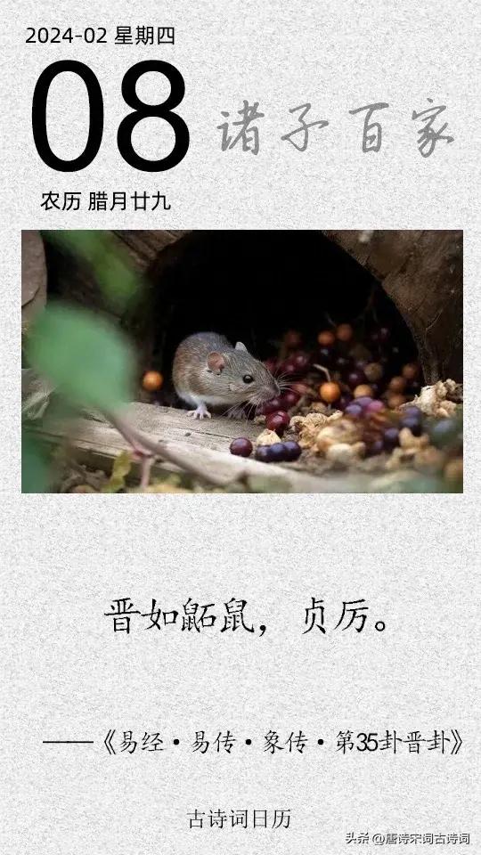 晉卦,除了知識提升,還有一層意思就是仕途晉升。“九四”爻辭說:“晉如鼫鼠,貞厲。”如果仕途晉升,採取的是像鼫鼠一樣的非正當手段,那麼晉升的道路上,一定會隱患重重。“鼫(shí)鼠”,又名“五技鼠”,“能飛不能過屋,能緣不能窮木,能遊不能度谷,能穴不能掩身,能走不能先人。”技術不行,還佔據高位,那麼一定會有災難。所謂,“德不配位,必有餘殃。”但只要真心悔過,一改前非,事情仍有轉機,此卦仍爲中上卦。